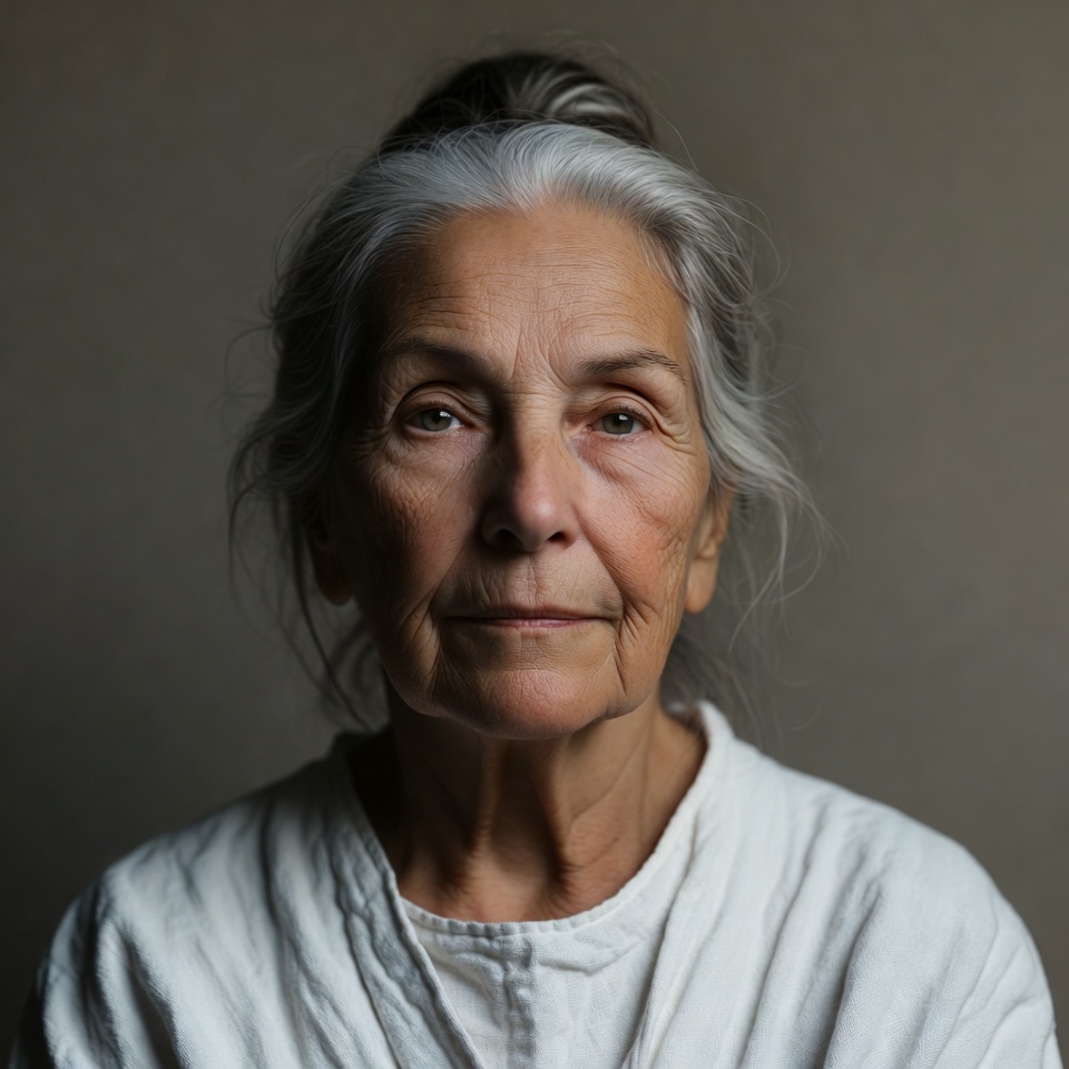 An elderly woman with long silver hair tied in a loose bun stares directly at the camera. She has a calm expression with subtle wrinkles around her eyes and mouth. She wears a loose white top against a plain beige background.