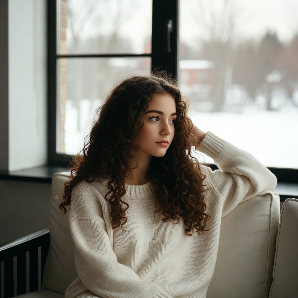 White, brown hair, couch, curly hair, female, gazing, hand on chin, indoor, portrait, sitting, snow, snowy landscape, thoughtful, white sweater, window, winter, young woman, woman