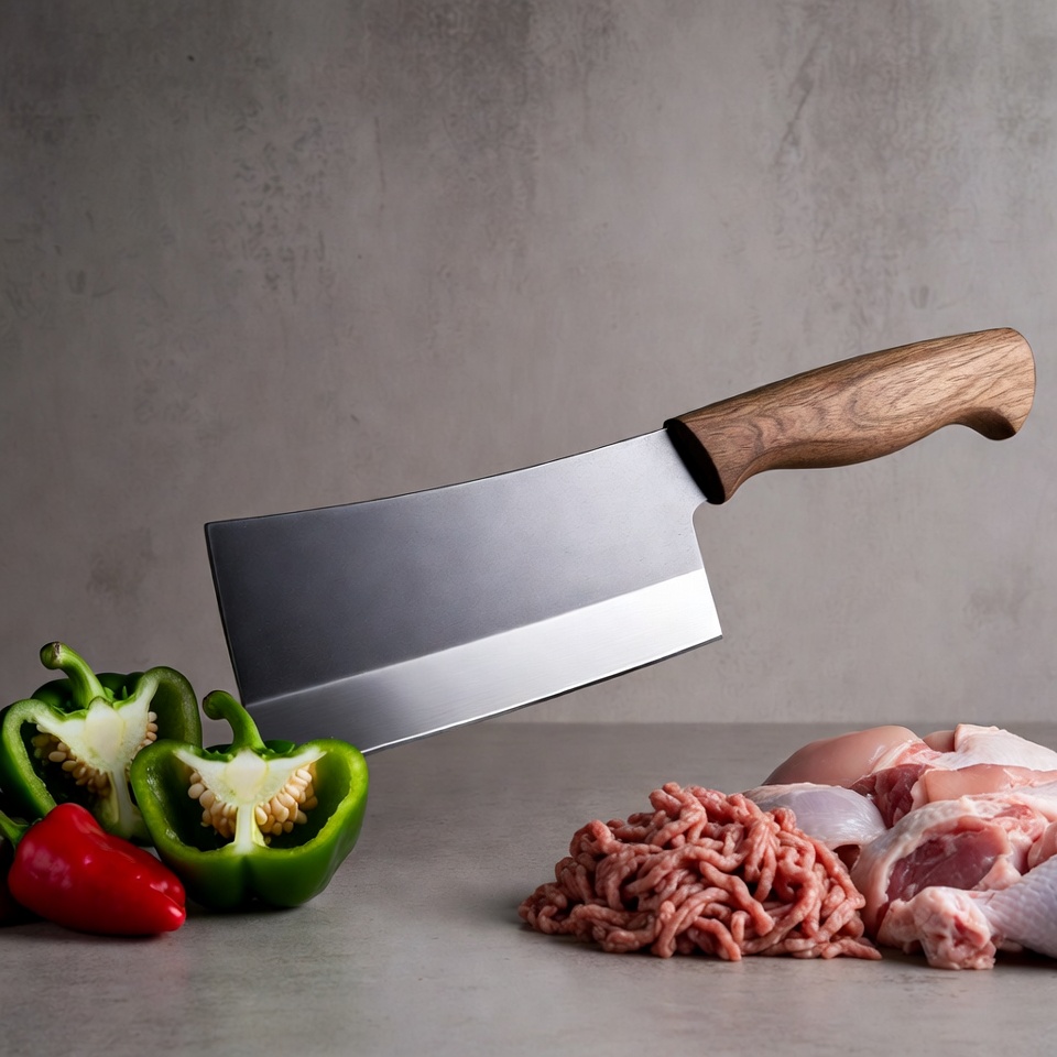 bell peppers, chicken, cooking, cutting board, food prep, fresh vegetables, gray background, green peppers, ground meat, kitchen, knife, meat cutting, peppers, pork, raw meat, red chili, steel blade, wooden handle, cleaver