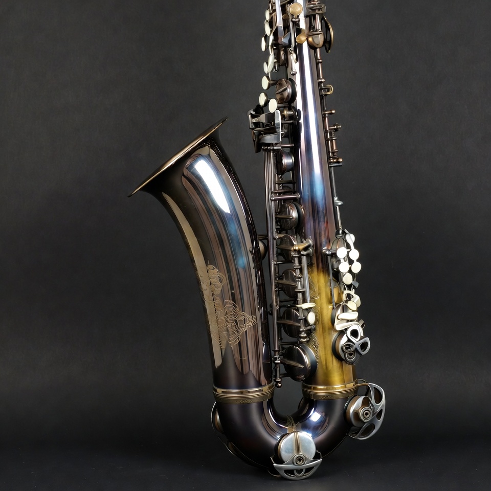 alto saxophone, black saxophone, brass instrument, brass keys, engraved bell, isolated background, jazz instrument, metallic finish, musical gear, musical instrument, purple hues, saxophone keys, shiny saxophone, wind instrument, saxophone