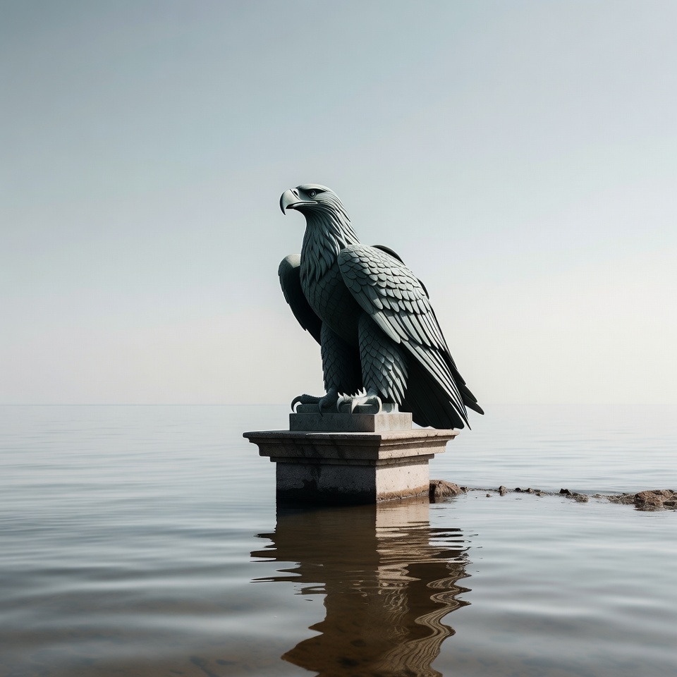 bird sculpture, bird statue, bronze statue, isolated background, majestic eagle, outdoors, sculpture, shallow water, stone pedestal, water reflection, wildlife statue, eagle