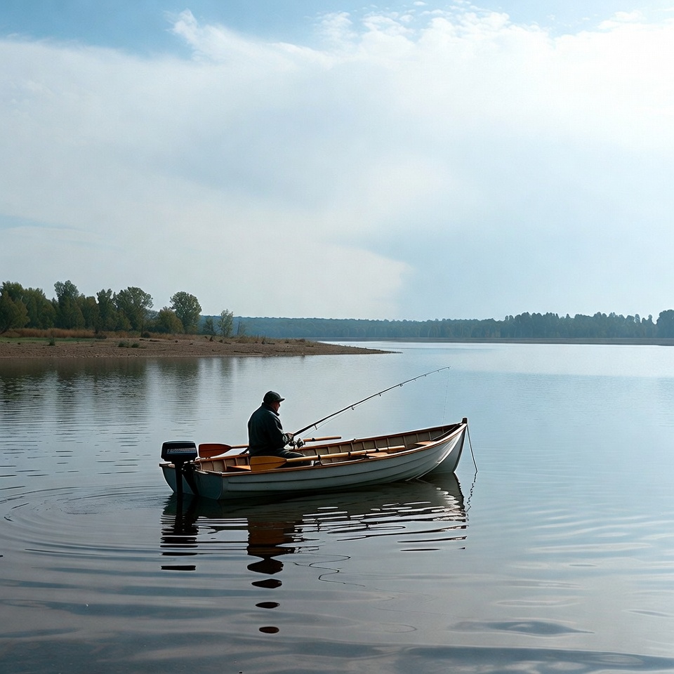 A man wearing a cap sits in a wooden rowboat on a calm lake, holding a fishing rod with line extended into the water. The boat has an outboard motor and oars, surrounded by gentle ripples. In the background, a tree-lined shore meets a partly cloudy sky.