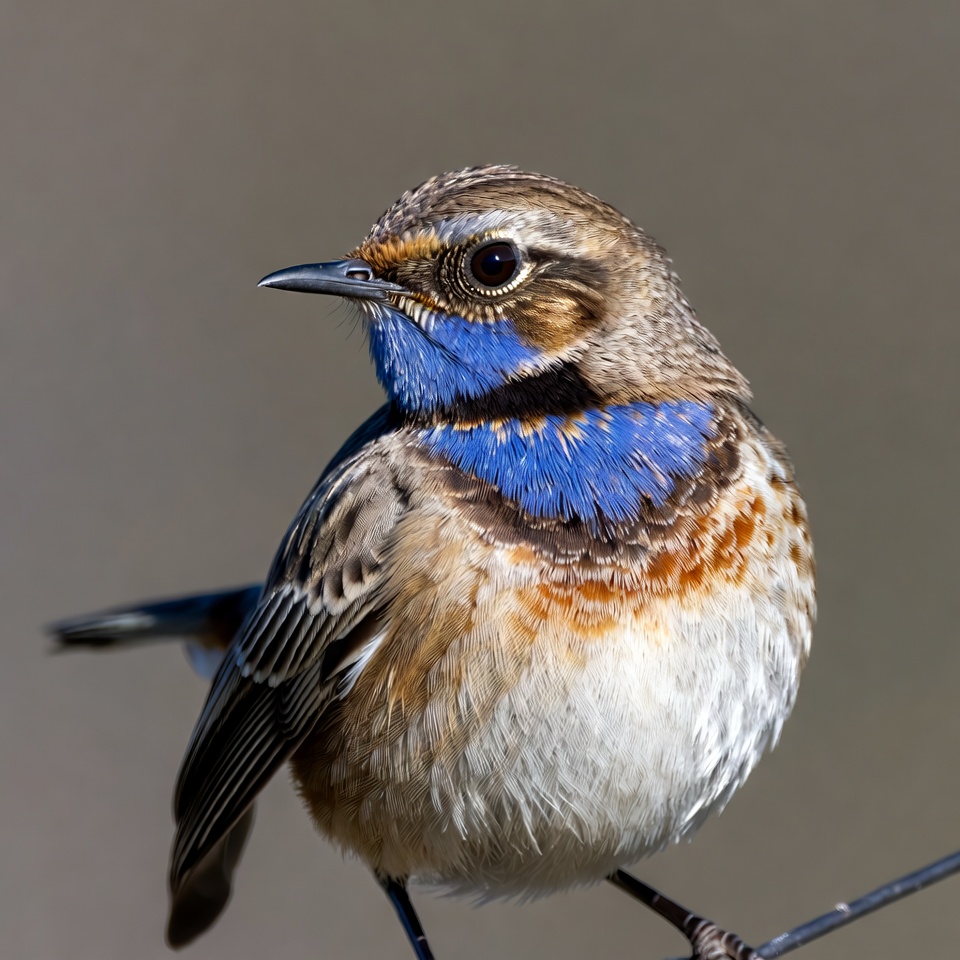 A small bird with brown and white feathers and a striking blue throat stands on a thin branch. Its head features orange tones and a sharp black beak, with large expressive eyes. The bird is viewed from the front against a blurred neutral background.