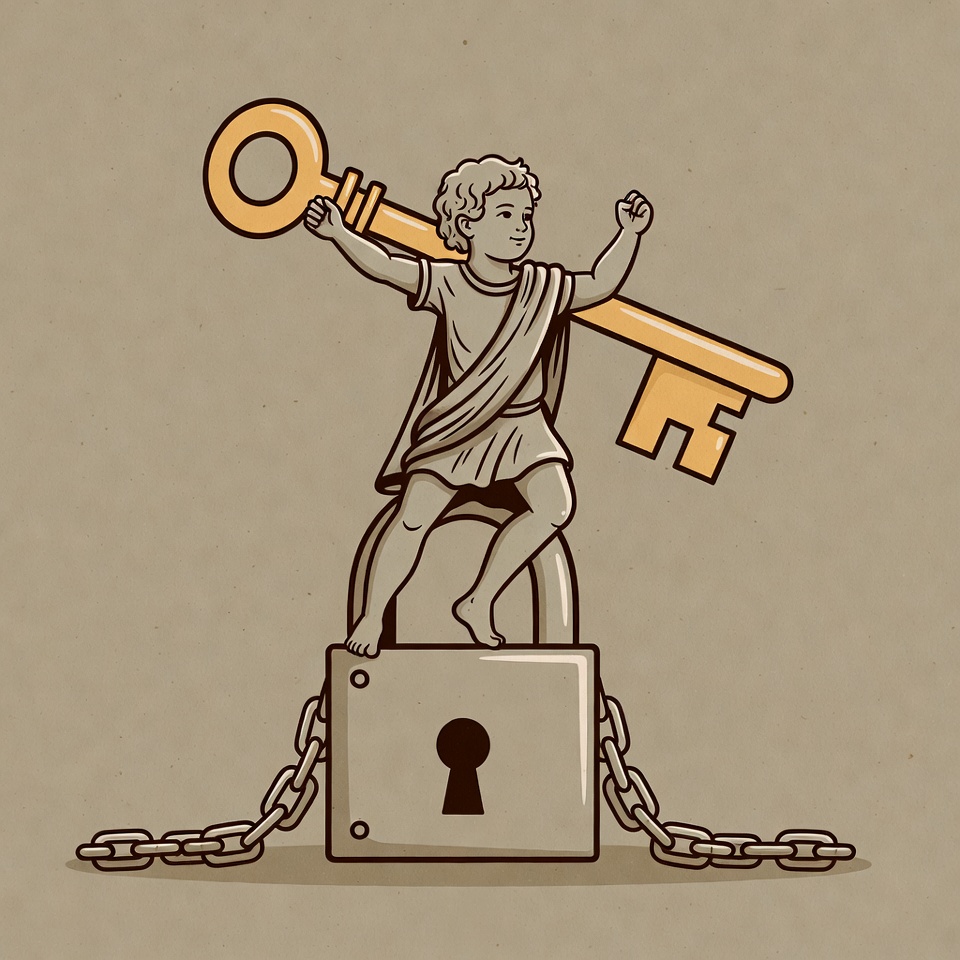 An illustration of a young boy standing triumphantly on a large padlock, holding a giant golden key above his head. He wears a classical tunic and toga, with curly hair and bare feet. Chains dangle from the open padlock on a beige background.