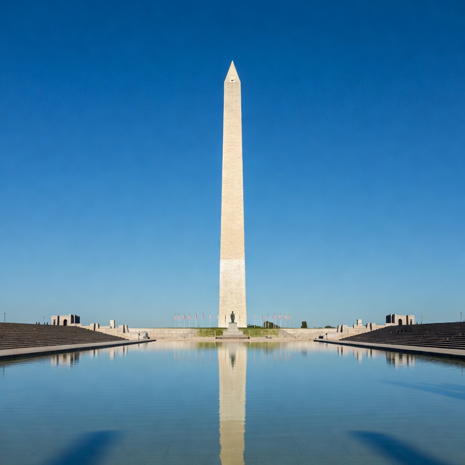 National Mall, United States, Washington DC, architecture, blue sky, capital, clear sky, daytime, flags, historical site, iconic landmark, landmark, memorial, monument, obelisk, pool reflection, reflecting pool, reflection, stone structures, symmetry, tall obelisk, white stone, Washington Monument
