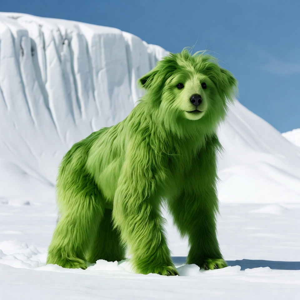 A cute green furry bear stands on snow with icy mountains in the background. The bear has fluffy green fur, expressive eyes, and a slight smile. A clear blue sky contrasts with the white snow and glacier.