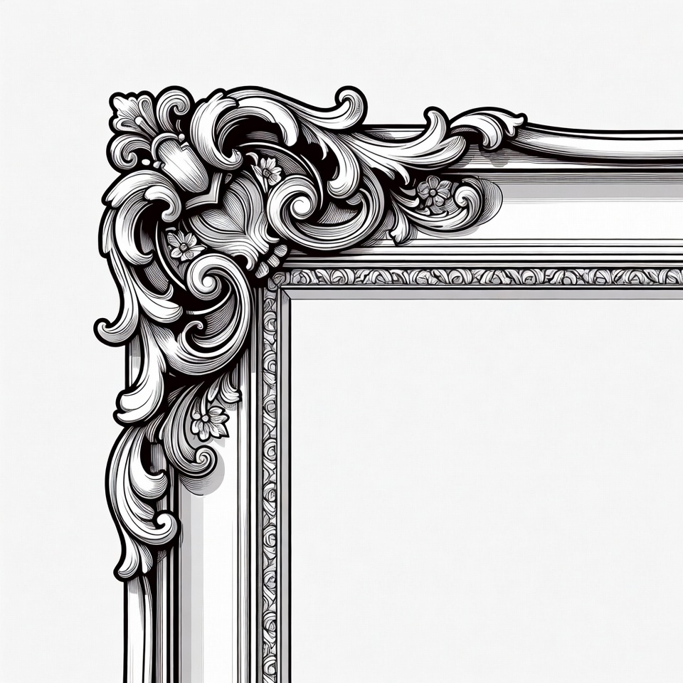 antique frame, baroque frame, black white, clipart, corner design, decorative frame, elegant frame, floral design, illustration, isolated background, leaves, line art, ornate frame, rococo frame, scrollwork, swirling motifs, vector art, vintage frame, picture frame