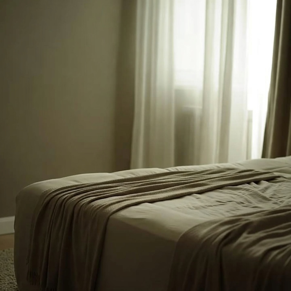 A close-up view of an empty bed with beige sheets and a draped blanket in a softly lit room. Sheer white curtains hang in the background window, allowing diffused natural light to filter through. The walls are painted in a neutral gray tone with a light carpet on the floor.