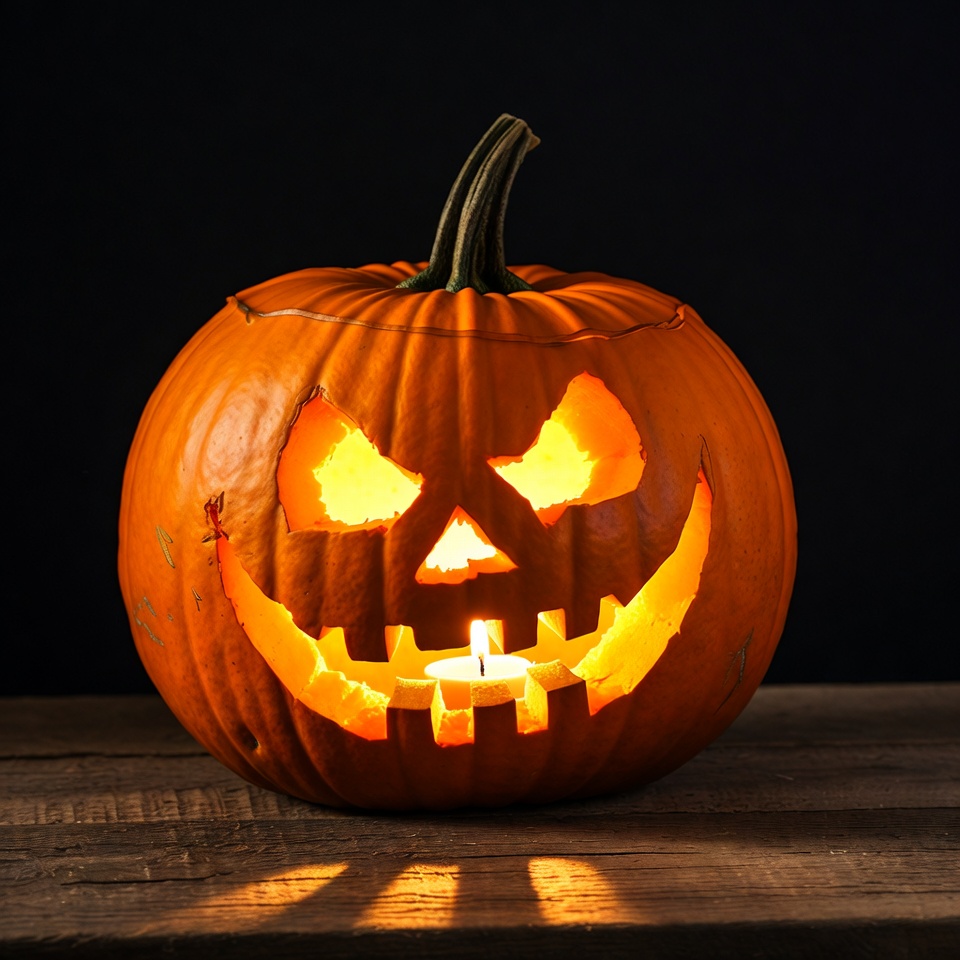 A carved orange pumpkin with glowing yellow eyes, nose, and jagged smile sits on a rustic wooden table. A small candle burns inside, illuminating the spooky face against a dark background. The pumpkin stem points upward, casting warm light and shadows.