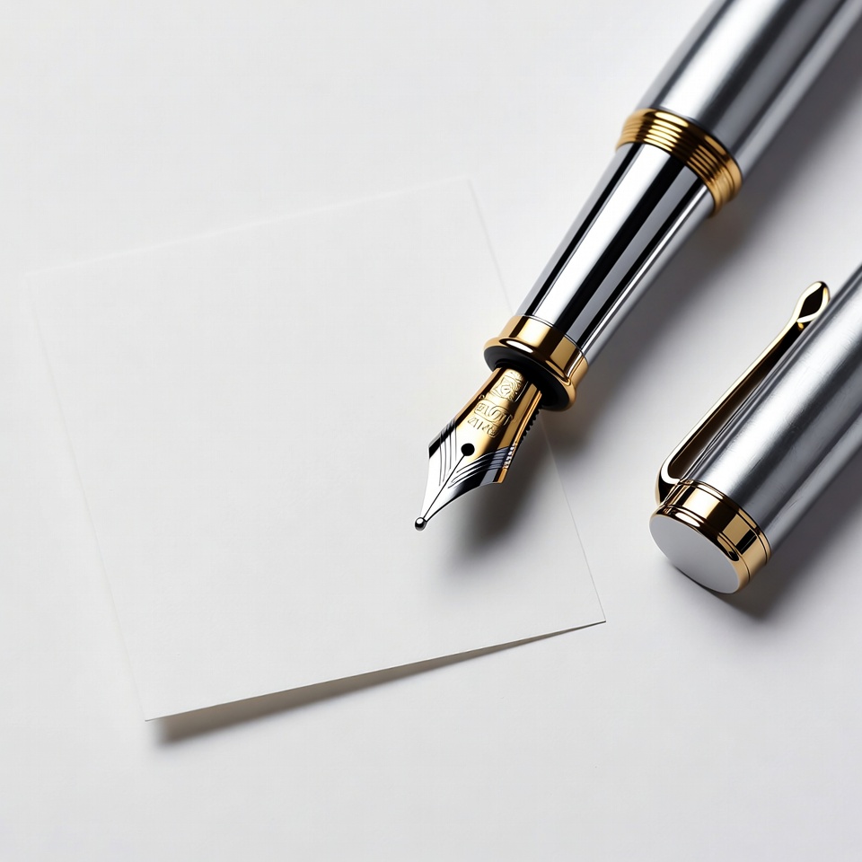 blank card, elegant pen, gold accents, isolated background, luxury pen, metallic pen, note card, office supply, pen nib, silver pen, stationery, white background, white paper, writing instrument, fountain pen
