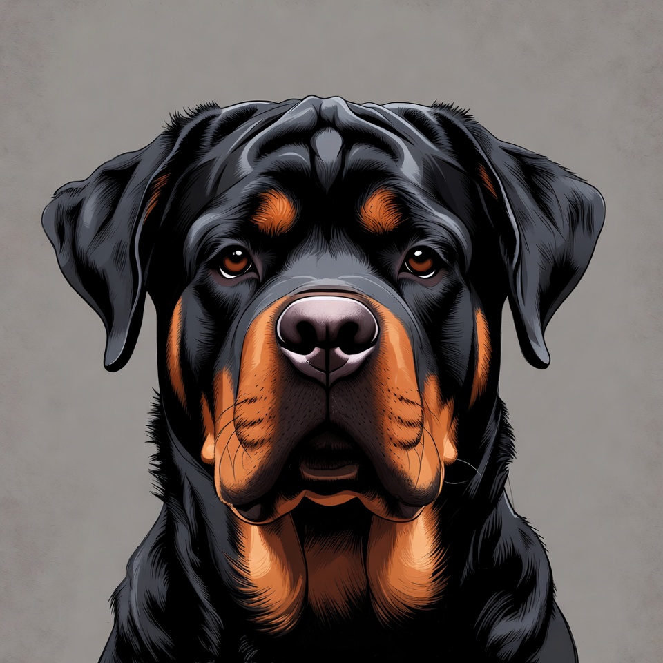 alert expression, animal, black fur, breed, brown eyes, canine, close-up, digital art, dog, face, fierce, guard dog, illustration, isolated background, loyal, muscular, pet, portrait, tan markings, Rottweiler