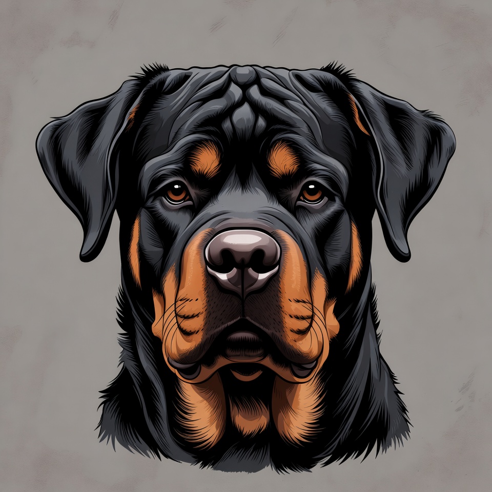A detailed illustration of a Rottweiler dog's face with black fur and tan markings on the muzzle, eyebrows, and chest. The dog stares forward with intense brown eyes and a serious expression. It is set against a plain gray background.