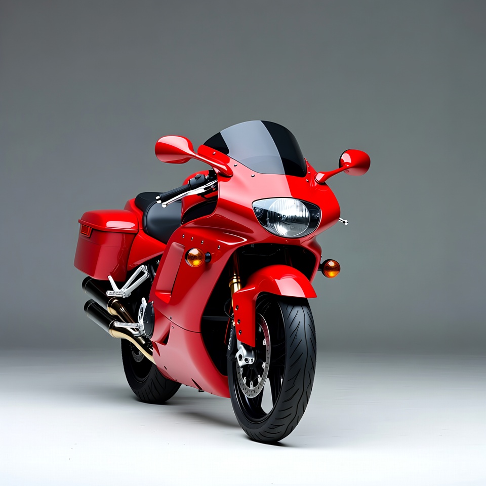 A vibrant red Ducati sport motorcycle is positioned frontally on a plain gray background. It features a sleek aerodynamic fairing, black windshield, red side cases, and polished silver exhaust pipes. The bike has black leather seat, red turn signals, and wide tires with silver brake calipers.