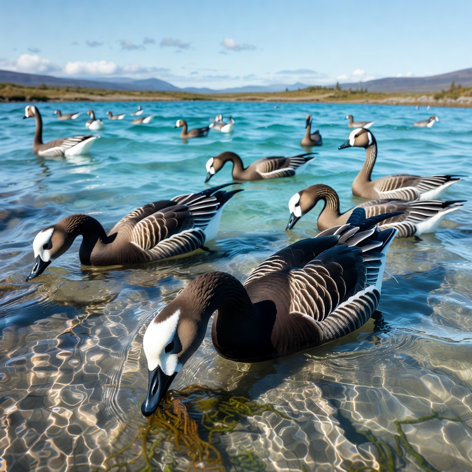 A group of bar-headed geese swims in a clear turquoise lake surrounded by mountains. They have distinctive black and white head markings, brown bodies, and white wing patches. Some geese are feeding on underwater vegetation in the shallow water.