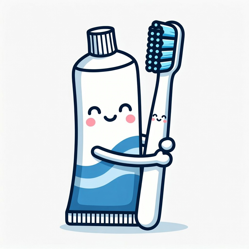 A kawaii illustration features a smiling white toothpaste tube with blue accents hugging a white toothbrush with blue bristles. Both objects have happy faces with rosy cheeks and closed eyes. The cartoonish design is set against a transparent background.