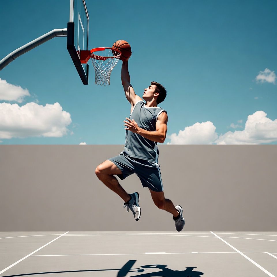 A muscular man in a gray tank top and shorts leaps high toward a basketball hoop on an outdoor court. He holds an orange basketball above the rim, wearing white Nike sneakers. The background features a clear blue sky with clouds and a concrete wall.