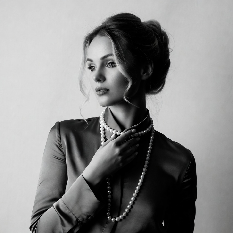 White, black and white, blonde hair, collared blouse, elegant, female, hand on neck, isolated background, pearl necklace, portrait, shiny shirt, side gaze, touching necklace, updo hairstyle, woman