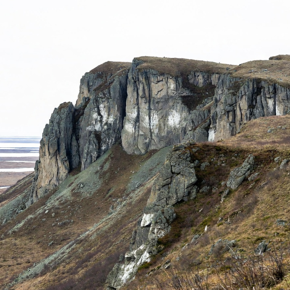 Tall rugged cliffs with layered rock formations rise sharply from grassy slopes. Sparse brown grass and patches of snow cover the terrain. In the background, a vast icy plain stretches under a cloudy sky.
