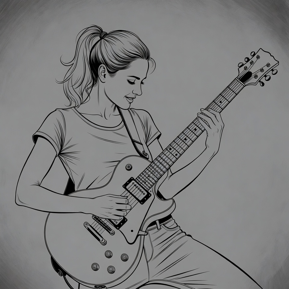 Les Paul, White, drawing, electric guitar, female, grayscale, guitar strap, illustration, isolated background, jeans, line art, musician, playing guitar, ponytail, ponytail hairstyle, rockstar, short sleeves, sketch, t-shirt, young woman, woman