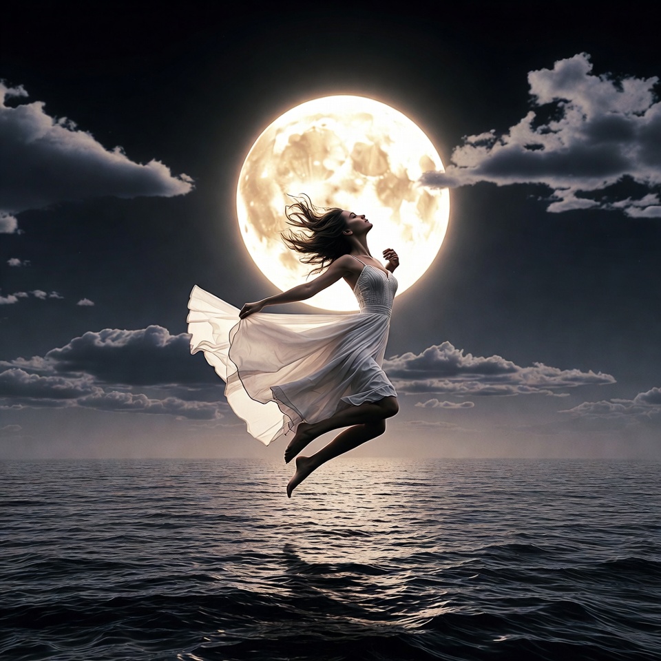A young woman with long flowing hair wears a white dress as she leaps gracefully over dark ocean waters. A large full moon illuminates the night sky with scattered clouds behind her. Her bare feet are extended, and her arms are outstretched in mid-air.
