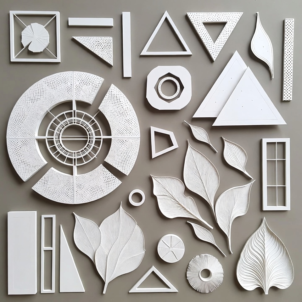 abstract art, angular shapes, circles, craft cutouts, curved leaves, cutouts, design elements, foliage silhouettes, geometric patterns, gray background, leaf veins, leaves, minimalist art, organic forms, paper cutouts, pie charts, polygons, rectangles, shapes collage, symmetrical design, triangles, vector shapes, white cutouts, white shapes, white silhouettes, geometric shapes