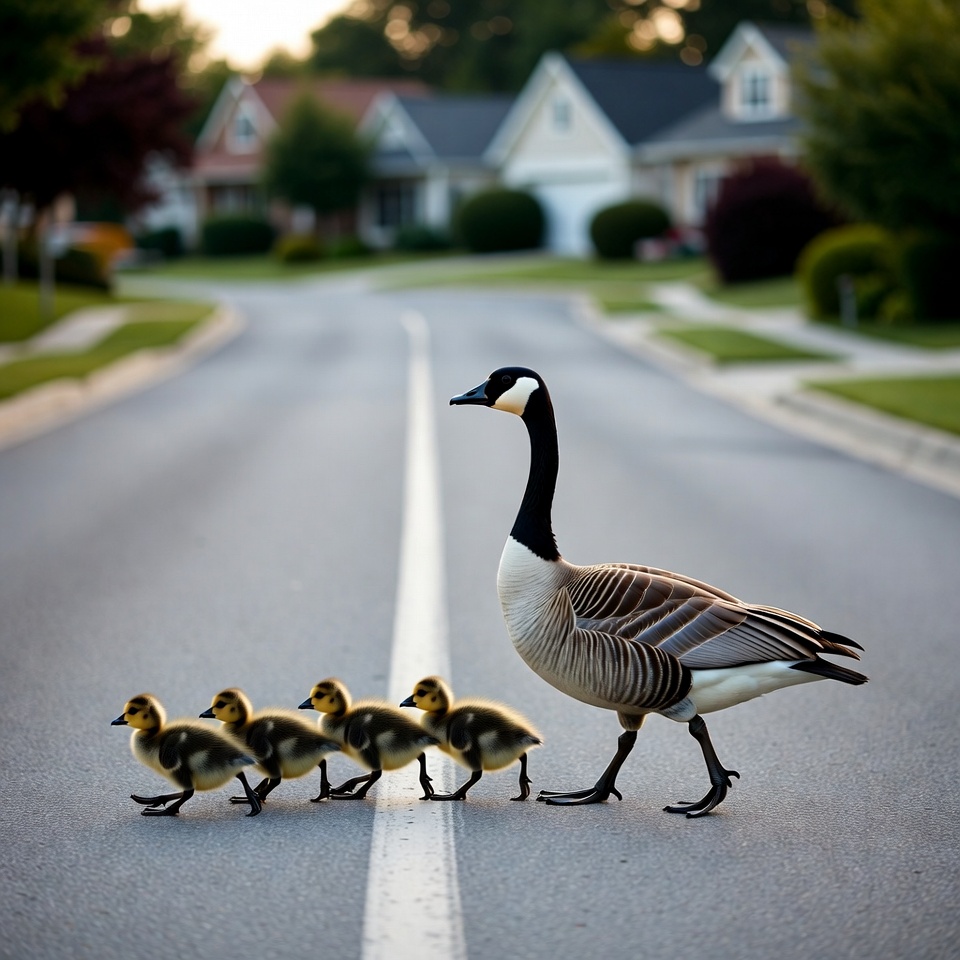 animal family, avian, baby geese, birds, black neck, feathers, flock, goose family, goslings, houses, lawns, nature, outdoors, parenting, residential neighborhood, street line, suburban street, trees, walking road, waterfowl, white face, wildlife, yellow goslings, Canada goose