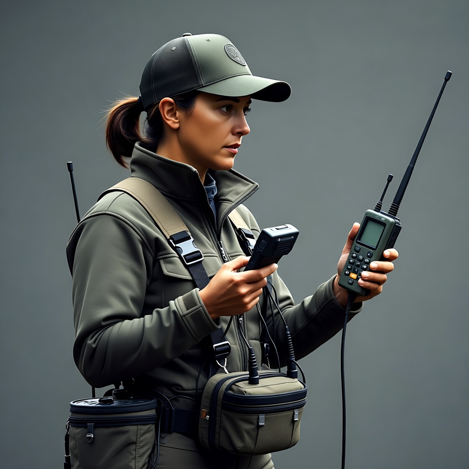 A woman in green tactical jacket and cap holds a handheld scanner and radio device. She wears a ponytail and stands against a gray background with utility pouches and antennas attached to her gear. Her expression is focused as she operates the equipment.