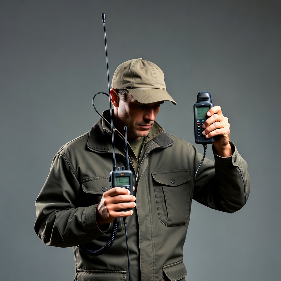 A man in a green jacket and cap holds two black handheld GPS devices with antennas on a gray background. He grips one in each hand, displaying the screens and controls. The devices feature long antennas and are connected by cords.