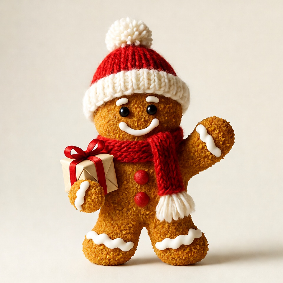 Christmas, big eyes, claymation style, cookie figure, cute gingerbread, festive, gift box, gingerbread, holiday, isolated background, knitted hat, pom pom, red hat, red ribbon, red scarf, smiling face, waving hand, white frosting, winter, gingerbread man