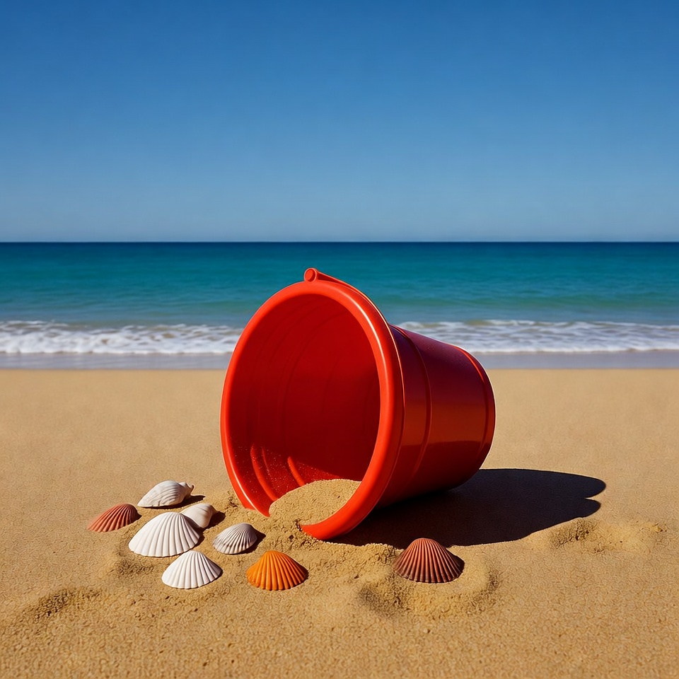 A red plastic beach bucket tipped over on golden sand spills out sand and various colorful seashells. White, orange, and brown seashells surround the bucket against a clear blue sky and turquoise ocean waves in the background. The scene is set on a sunny beach with gentle waves lapping at the shore.