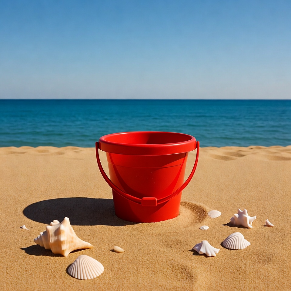 A red plastic beach bucket sits in the sand near the ocean with scattered white seashells around it. The clear blue sky and calm sea waves form the background. Shadows from the bucket and shells are cast on the sandy beach.