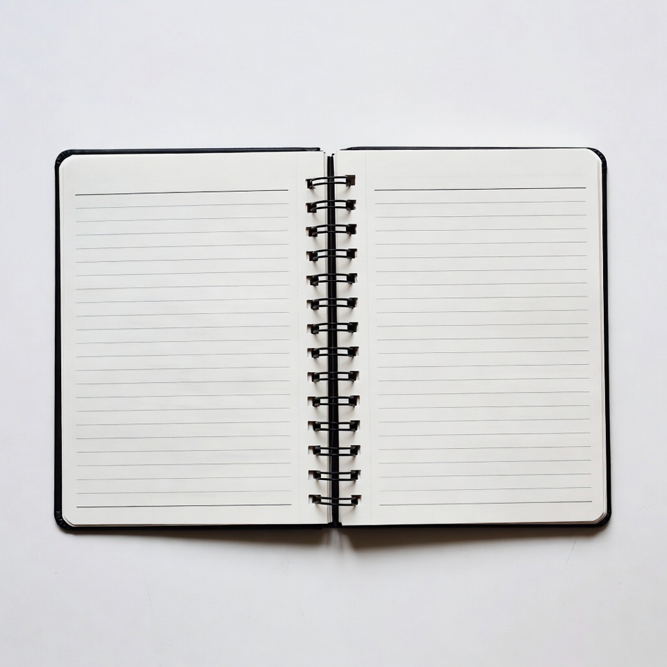 A black spiral-bound notebook lies open on a plain white surface. Both pages display clean lined paper, ready for writing. The sturdy black cover frames the exposed spiral binding in the center.