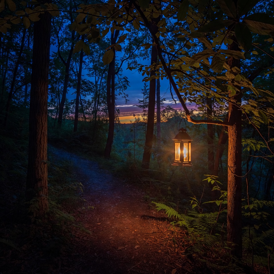 blue tones, branches, dark forest, dirt path, dusk, evening, ferns, foliage, forest path, glow, hanging lantern, isolated background, nature, night, outdoor, pathway, sunset sky, trail, trees, twilight, warm light, woodland, woods, lantern