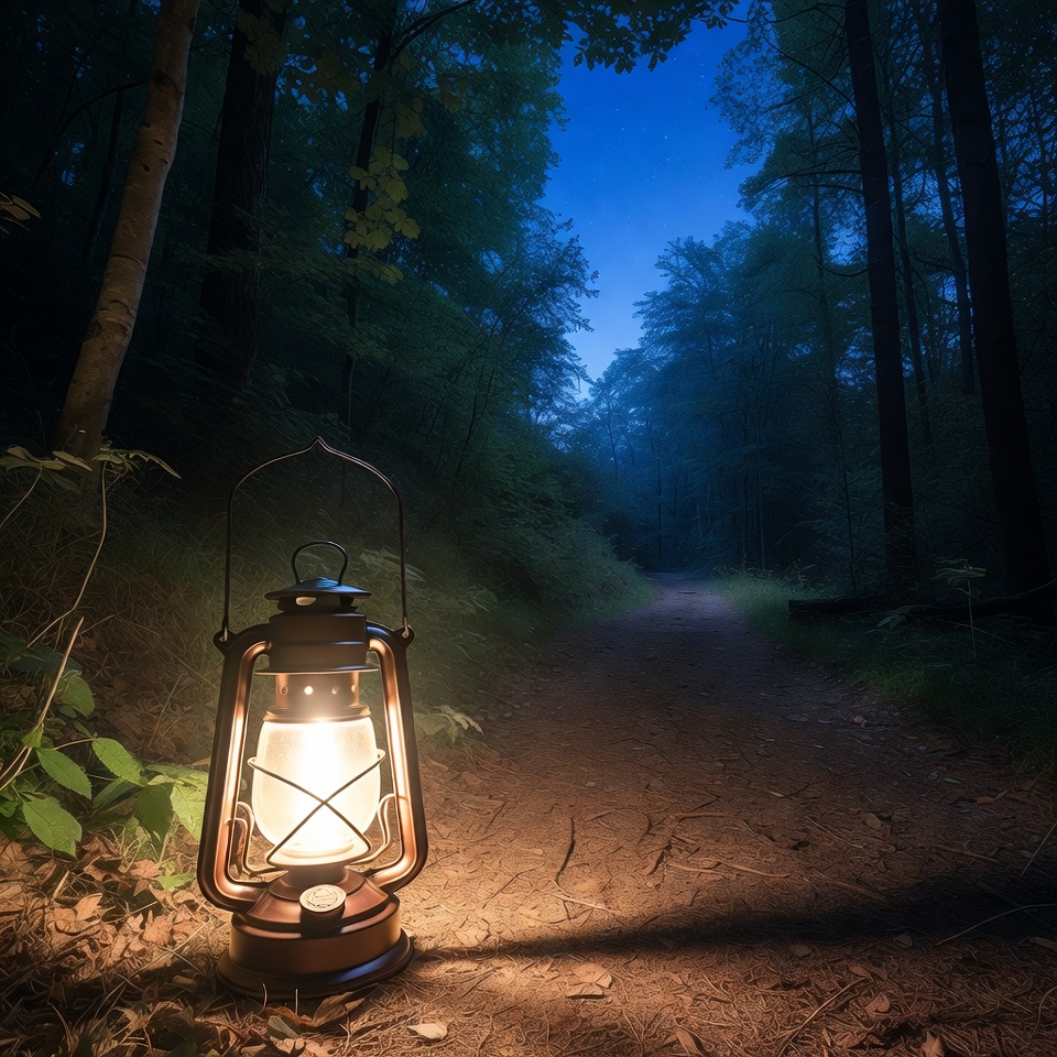 birch trees, blue sky, dark forest, dense woods, dirt path, evening, foliage, forest, glowing light, grass, hiking trail, illuminated trail, leaf canopy, nature, night, nighttime path, outdoor, path, shadows, trail, trees, twilight sky, vintage lantern, warm light, woods, lantern