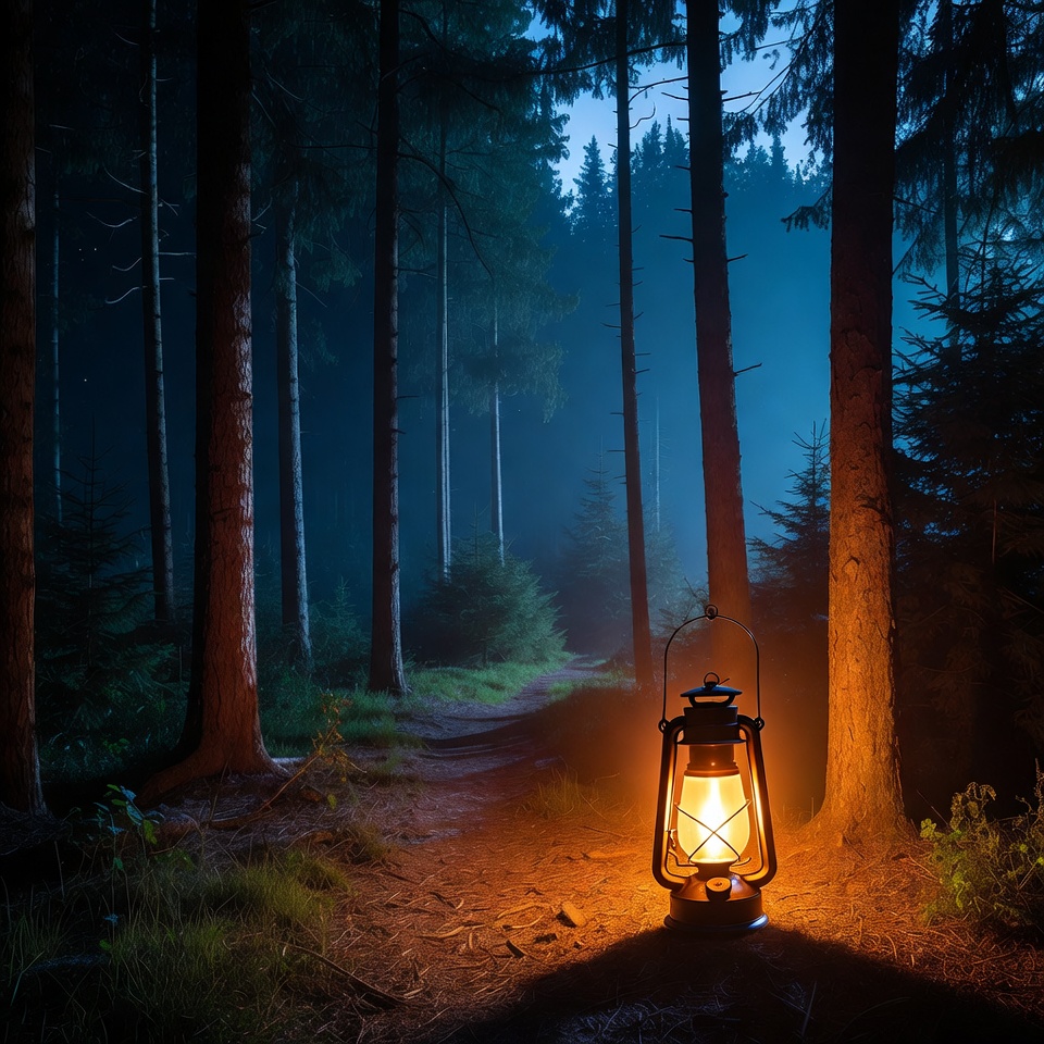 atmospheric, coniferous forest, dark woods, dense forest, evergreen trees, fir trees, foggy woods, forest, forest trail, glowing light, hanging lantern, illuminated path, lantern light, moonlight, night, night scene, outdoor, path, pine trees, trail, trees, vintage lantern, woodland path, woods, lantern