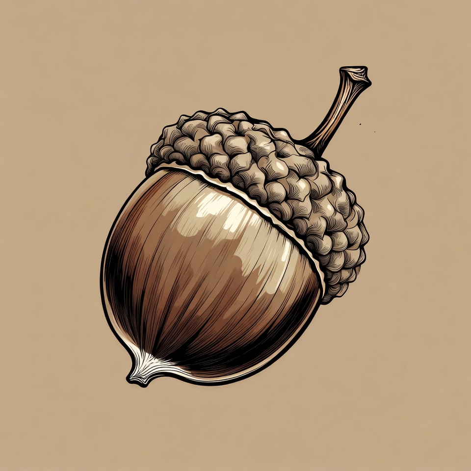 A detailed line art illustration of a single acorn with a textured cap and stem. The acorn features brown shading and highlights on a solid beige background. It is depicted in a realistic style with intricate line work.