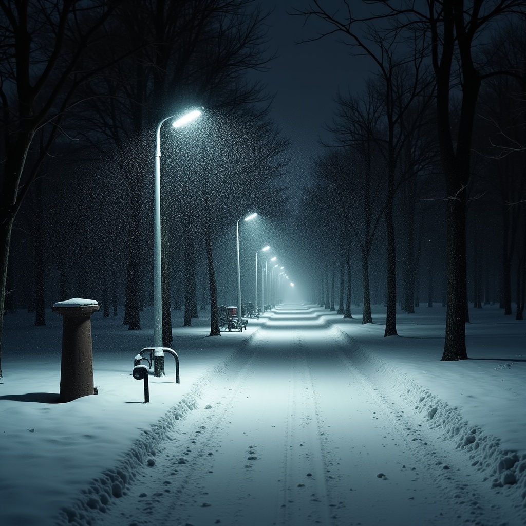 bare trees, cold weather, dark forest, dark trees, empty path, fire hydrant, forest path, glowing lights, illuminated trees, light snow, misty snow, night scene, nocturnal scene, park bench, pathway lights, snow falling, snow-covered trees, snowy ground, streetlights, tree alley, urban park, white snow, winter landscape, winter night, snowy path