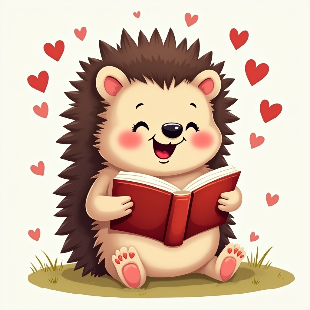 adorable hedgehog, animal illustration, book reading animal, cartoon hedgehog, children's illustration, clipart, cute hedgehog, floating hearts, green grass, happy animal, hearts, isolated background, kawaii hedgehog, pink paws, reading book, red book, smiling hedgehog, spiky quills, vector art, hedgehog