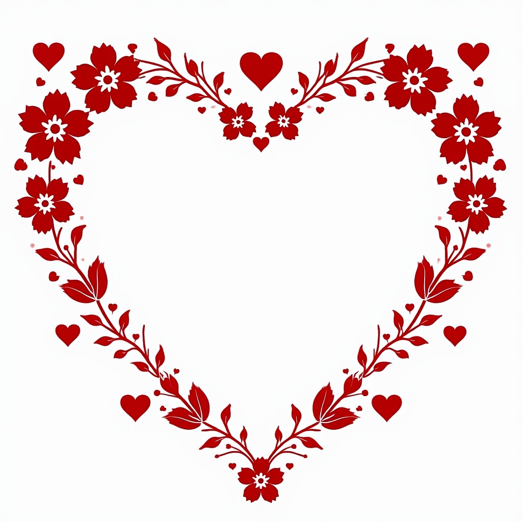 A large heart-shaped frame made of intricate red flowers and vines on a white background. Small red hearts are scattered within the floral design. The artwork features detailed petals and leaves forming an ornate border.