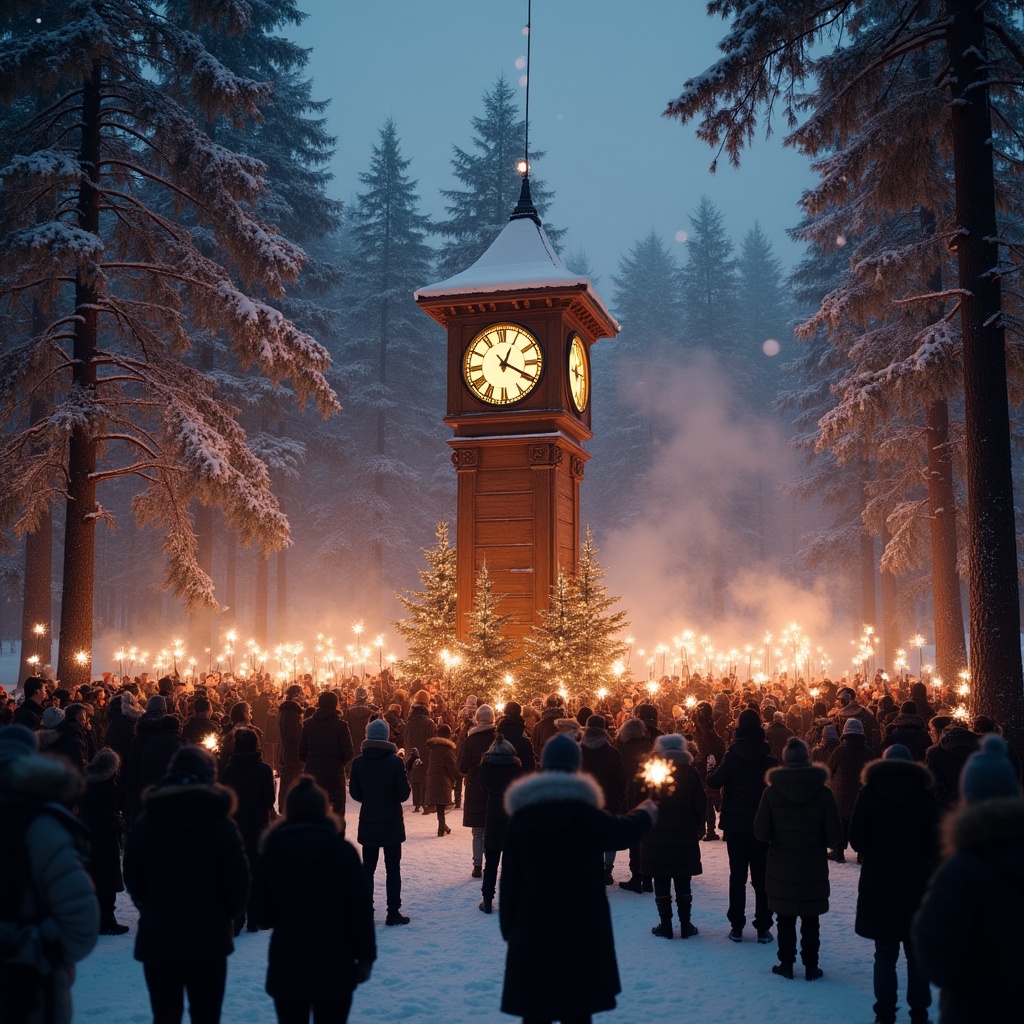 Christmas tree, bundled up, celebration, coats, crowd, dusk, evergreen trees, festive, fog, gathering, hats, holding torches, illuminated clock, men, outdoor event, people, pine trees, snow, snowy forest, snowy ground, torches, winter crowd, winter night, women, clock tower