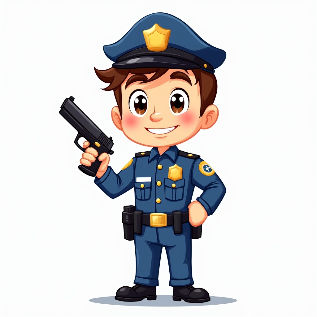 A cute cartoon boy dressed as a police officer stands confidently with a handgun in his right hand. He wears a blue police uniform, hat with badge, and black shoes on a white isolated background. His large expressive eyes and smiling face give him a cheerful chibi style.