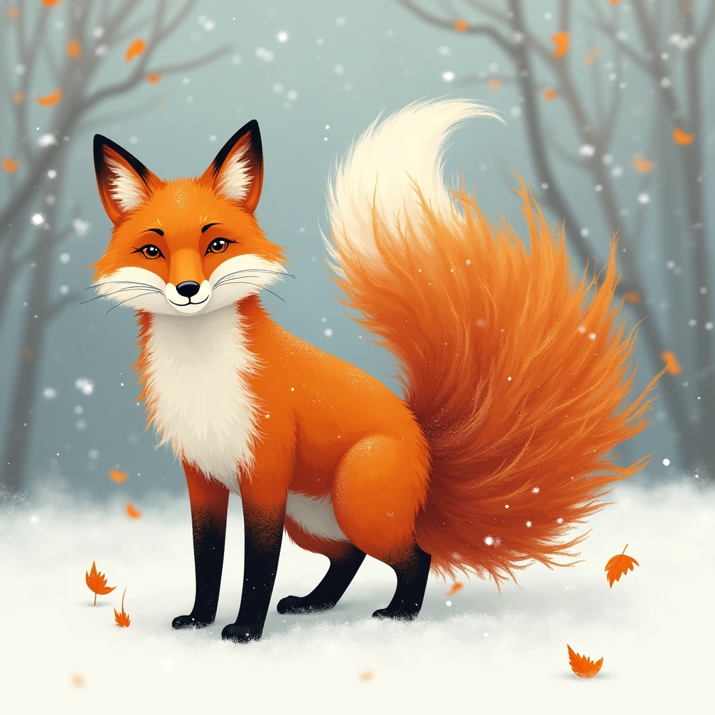A digital illustration features a cute red fox with white-tipped fluffy tail standing on snowy ground surrounded by bare trees. Orange autumn leaves are scattered around and falling gently. The fox has bright eyes and a friendly expression against a misty gray background.