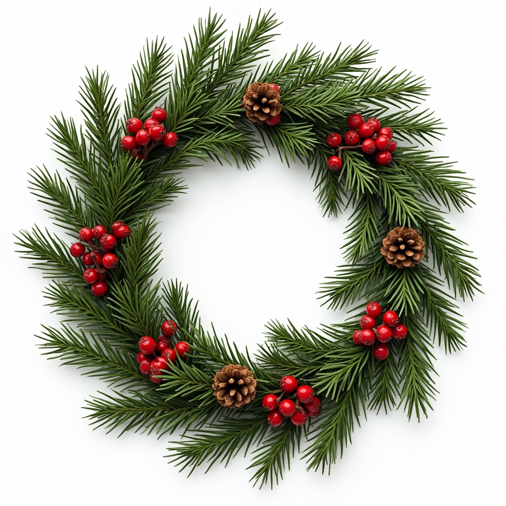 A circular Christmas wreath made of lush green pine branches is adorned with red holly berries and brown pinecones. The wreath has an open center and is placed on a plain white background. The berries and pinecones are evenly distributed around the evergreen boughs.