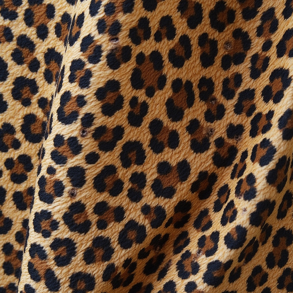 animal print, apparel fabric, black spots, bold pattern, close-up, draped fabric, fabric, fashion fabric, fuzzy fabric, luxury print, pattern, plush material, rosettes, sewing material, soft texture, spotted fabric, tan background, texture, wildlife pattern, leopard print