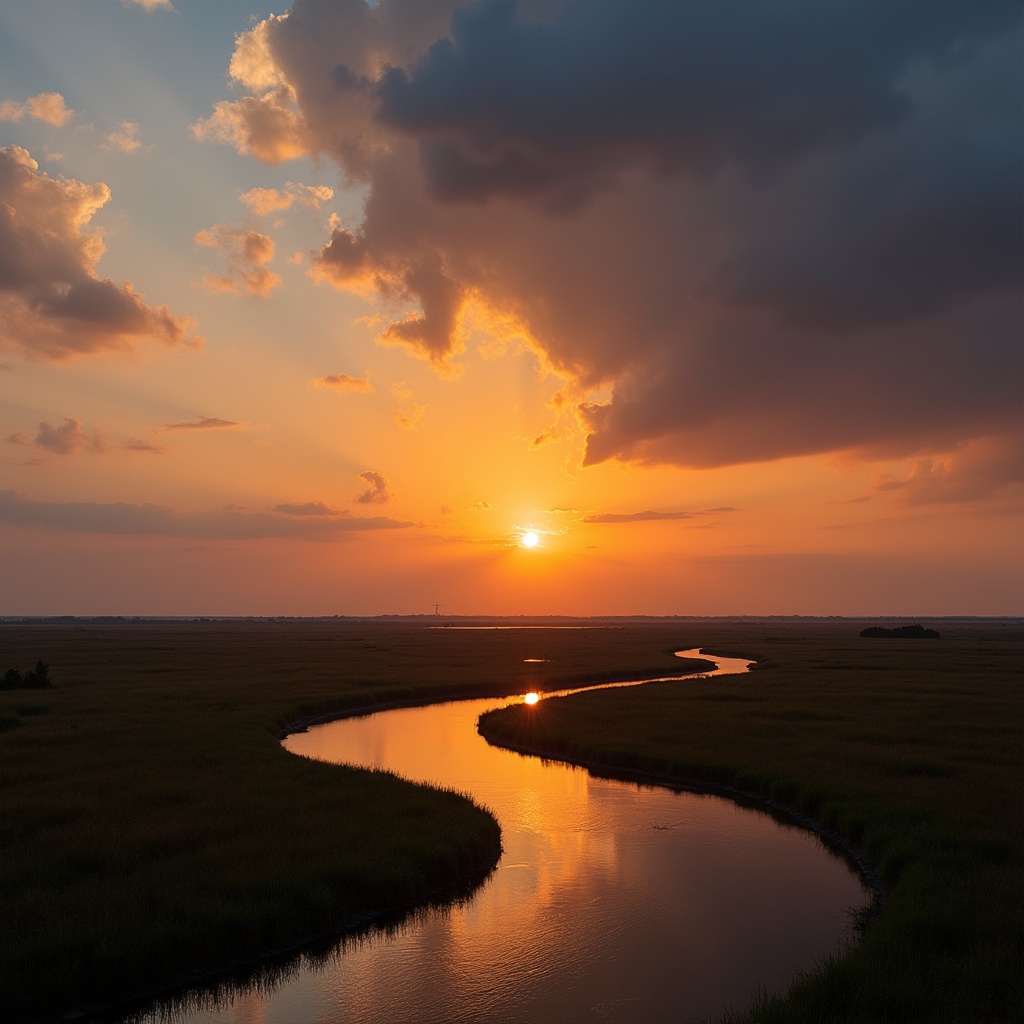 A vibrant orange sun sets behind dramatic gray clouds, illuminating a winding river snaking through tall marsh grasses. The water reflects the golden sunset hues and surrounding landscape. The scene features a flat horizon with distant vegetation under a cloudy sky.