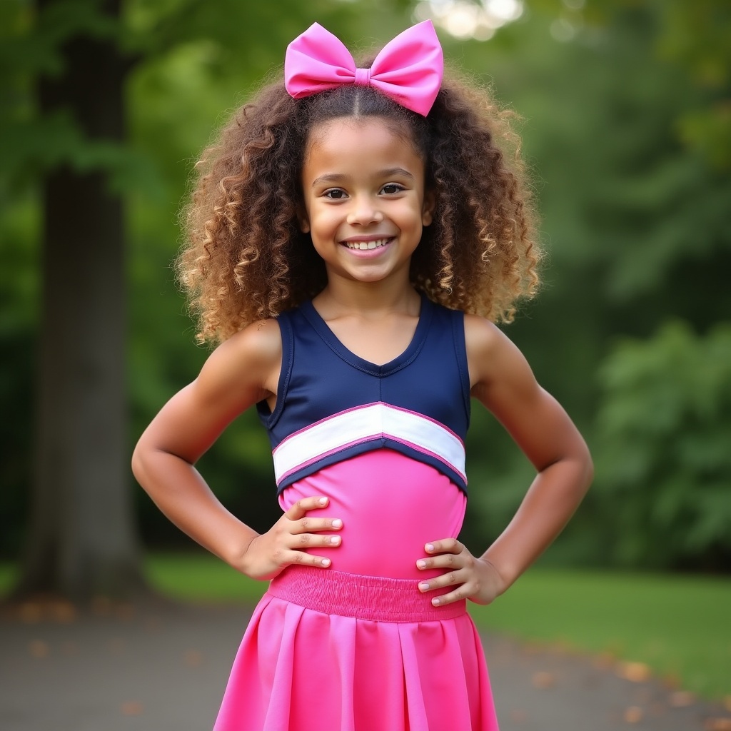 A young Black girl with curly hair and a large pink bow smiles while standing outdoors. She wears a navy and pink cheerleader uniform with a pleated skirt and poses with hands on hips. The background features green grass and trees.
