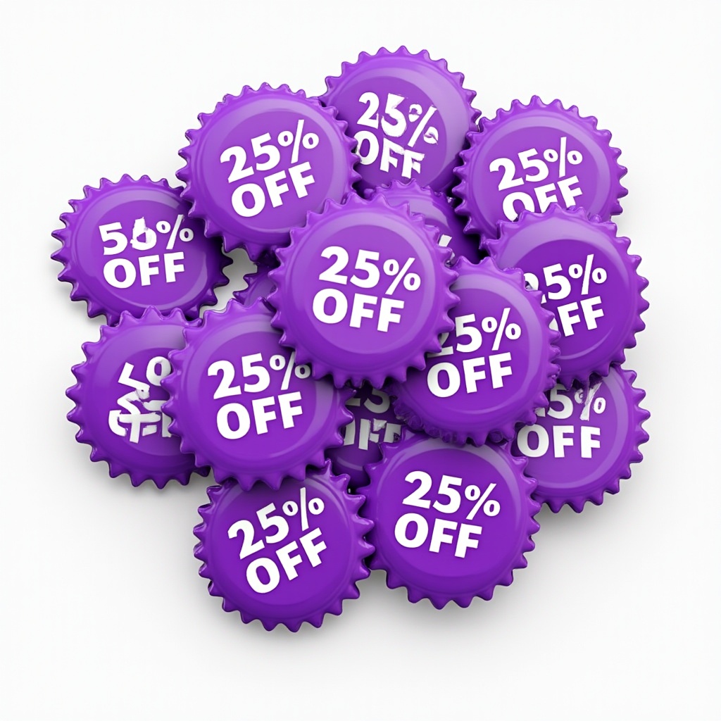 A cluster of shiny purple bottle cap-shaped badges displays '25% OFF' in white text. They are piled together on a white background, creating a promotional sale graphic. The badges have a glossy, 3D appearance with metallic edges.