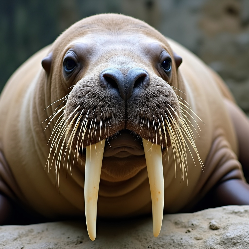 A walrus with thick brown fur and prominent long white tusks stares directly at the camera. Its large dark eyes and wide snout with whiskers are in sharp focus against a blurred rocky background. The walrus lies relaxed on a stone surface.