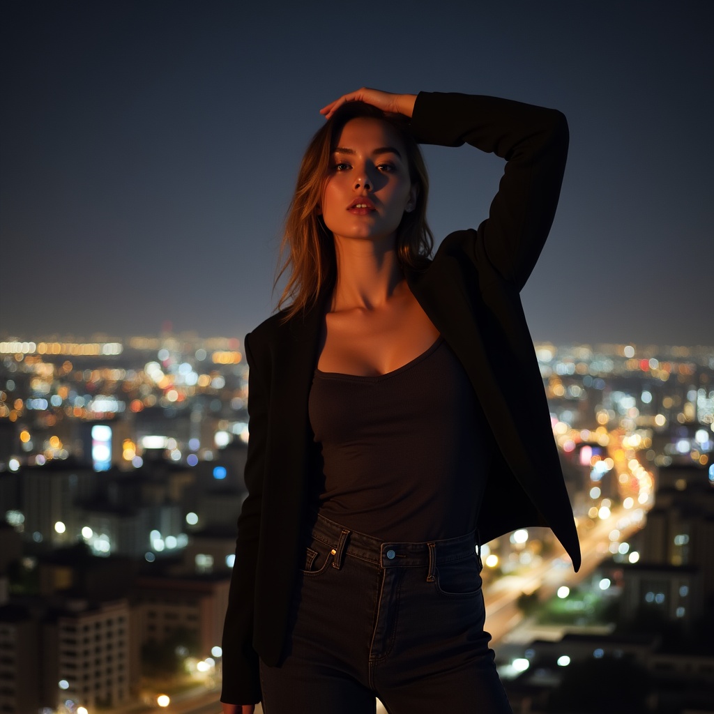 A young woman with long wavy brown hair stands confidently on a rooftop at night, posing with one hand on her head. She wears a black blazer over a black camisole top and dark jeans. A brightly lit city skyline with buildings and traffic lights stretches out behind her under the dark sky.