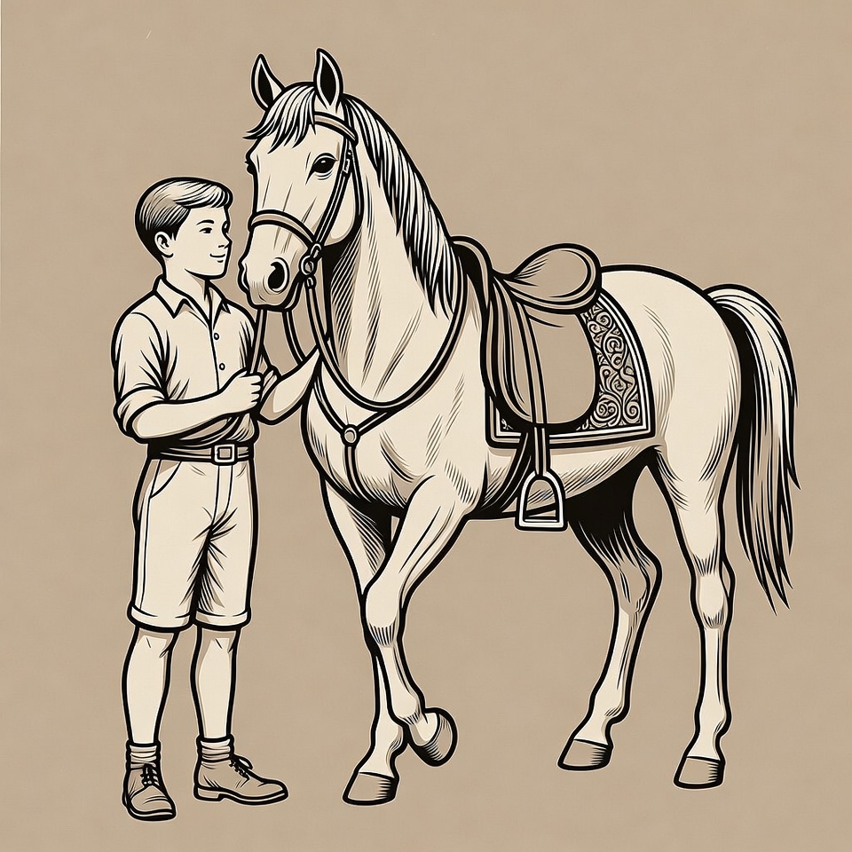 A line art illustration depicts a young boy in short-sleeved shirt, shorts, and boots standing beside a tall saddled horse on a beige background. The boy holds the reins gently while looking at the horse's face. The horse stands calmly with ornate saddle details and flowing mane.